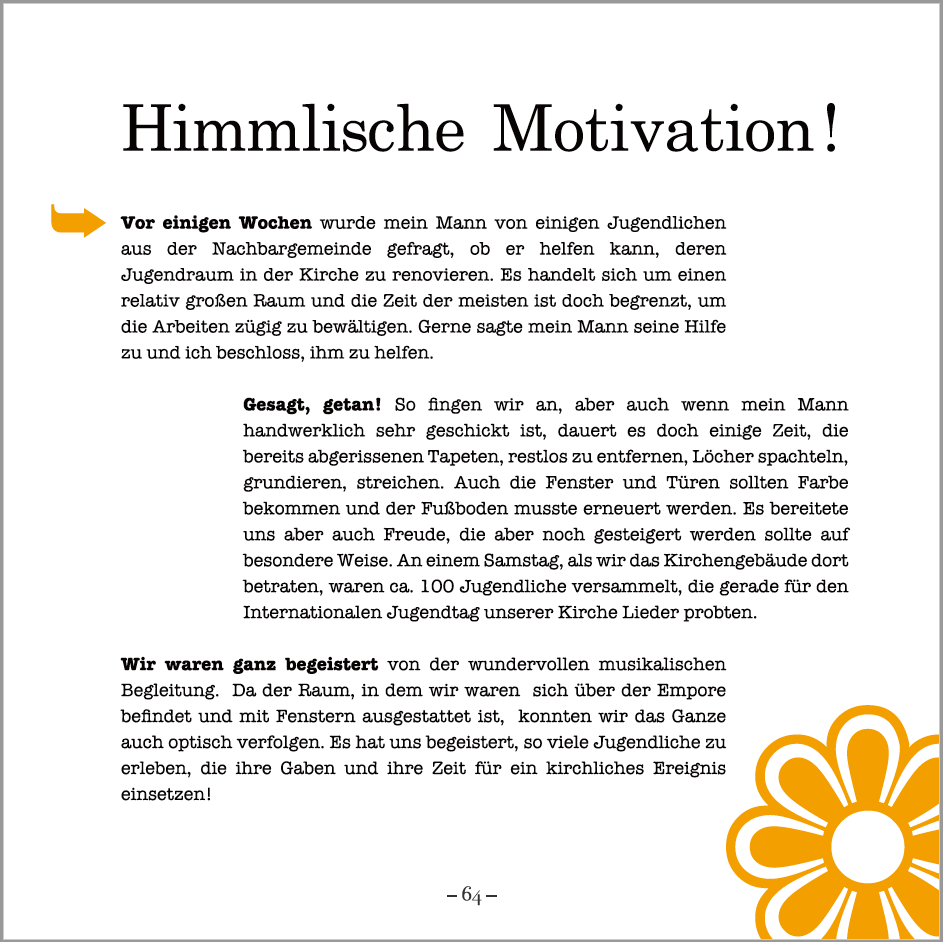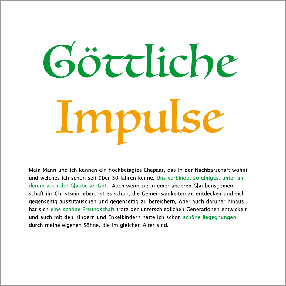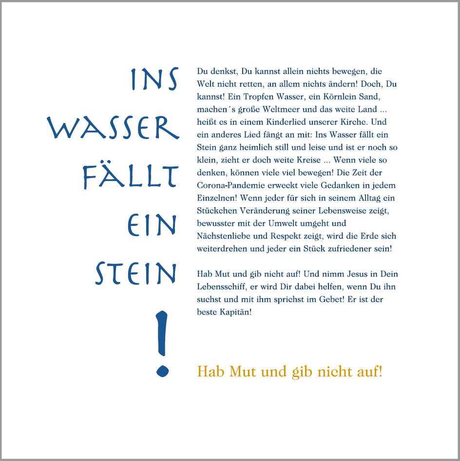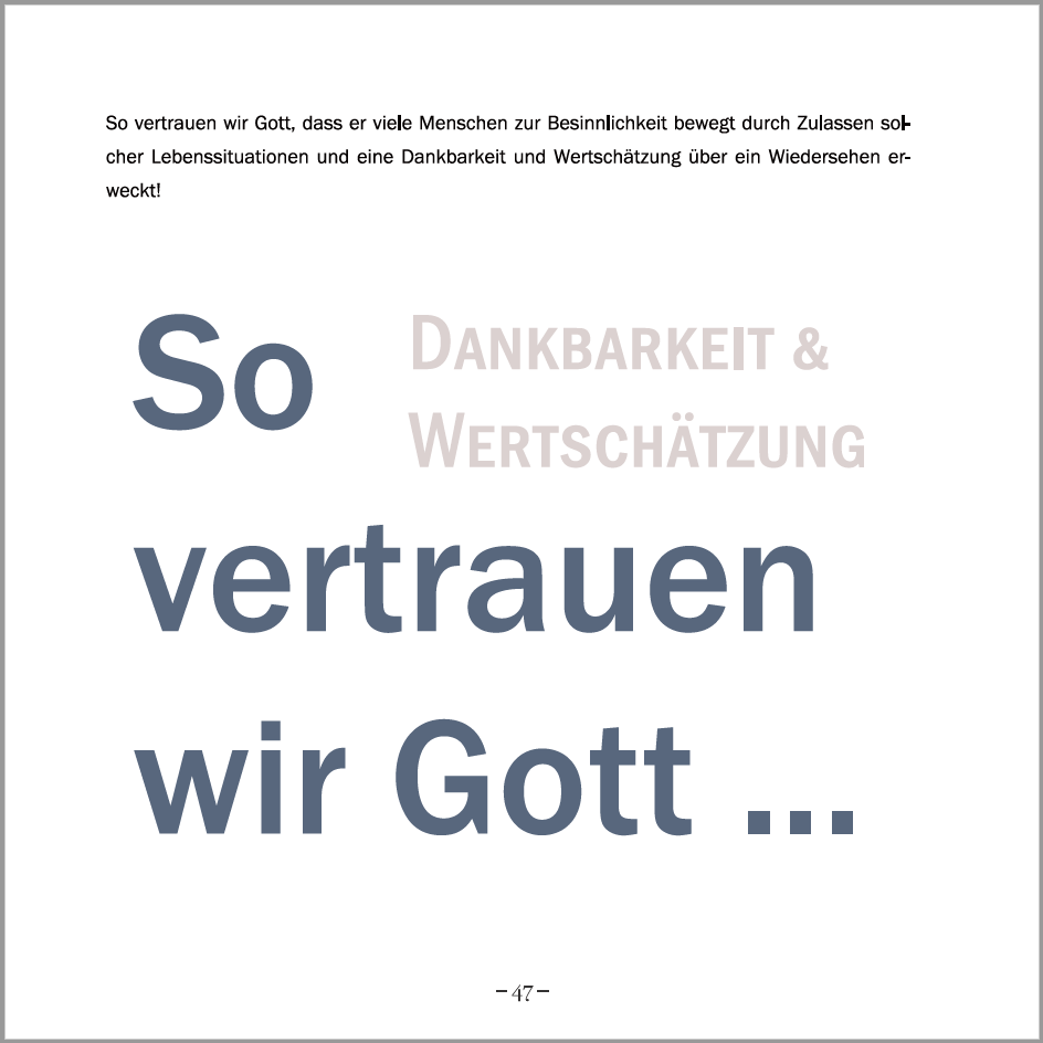 Obenauf liegt der Hauptgedanke: Gott lässt vieles zu, aber er hilft es zu tragen! Er ist jeden Tag bei uns, auch wenn wir ihn nicht sehen. Lasst uns im Gebet seine Nähe suchen und auf die kleinen Dinge schauen, in denen er sichtbar wird. Und auch wenn man vieles nicht versteht auf dieser Erde, werden wir eines Tages keine Fragen mehr haben, nämlich wenn der Herr Jesus wieder kommt, wie es verheißen ist! Wir entscheiden selbst, ob wir glauben und danach handeln und Gott vertrauen bis zum Ende!
