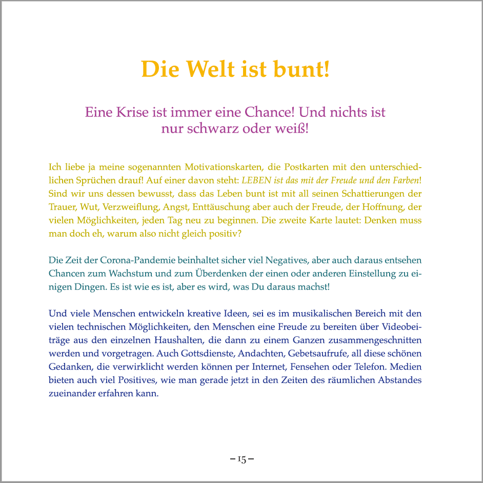 Während der Corona-Pandemie, die seit Monaten auf der Welt herrscht, sind mir verschiedene Gedanken gekommen, ich habe einiges erlebt und es bewegt mich vieles. Deswegen ist es mir gerade jetzt wieder ein Bedürfnis, das schriftlich festzuhalten, wie ich es auch in den beiden vorangegangenen Büchern schon getan habe.